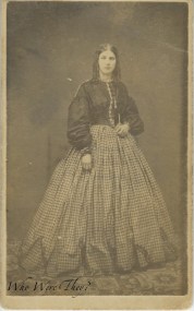 I particularly love this photo of a young girl taken during the 1860s. At first blush, it gives the impression that she doesn’t have much – her skirt and blouse do not match, the skirt drags on the ground on one side and is high on the other, little details. But, after I scanned and enlarged the image, I see that her bodice has trim on the cuffs, across the shoulder and down the front that likely coordinated with the skirt fabric. Also, the skirt has a deep chevron shaped trim at the hem, which was generally eschewed because a. trims were expensive and b. you need a lot to trim a skirt that could be 150″ circumference! For the math-challenged, that is 12 1/2 feet at the hem. I suspect this style of solid colored bodice to plaid skirt was on trend for her peer group.