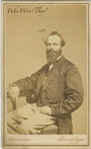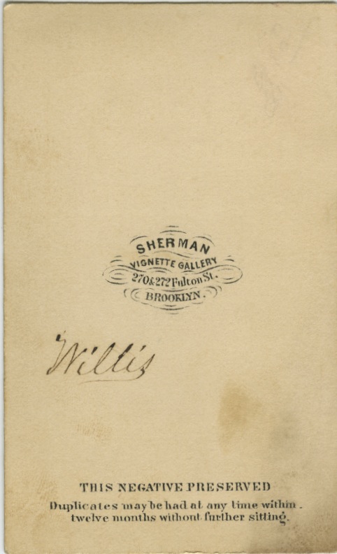 This fine gentleman is Willis. No other name was noted, and so we shall probably never know exactly who Willis was. Was Willis his first or last name? He was in his middle aged years when he sat for his portrait at the Sherman Vignette Gallery on Fulton Street, Brooklyn, NY. Note his full beard, but his hair could have used a trim. You can just see his frock coat tails falling behind him. The photo can be dated to the latter 1860s by the square corners and borders around the image.