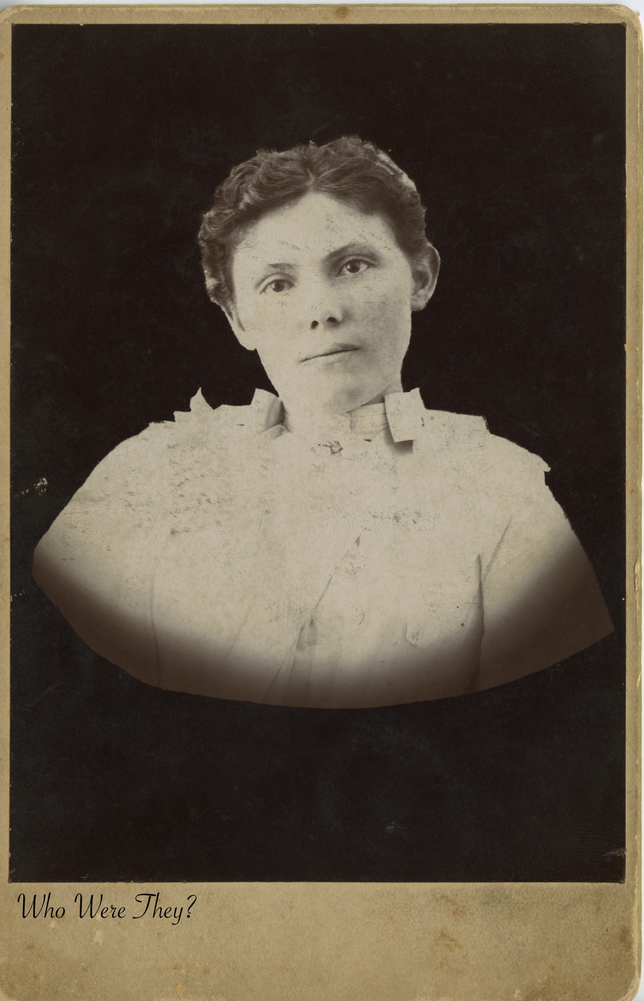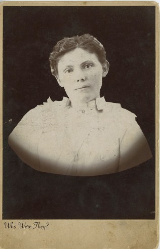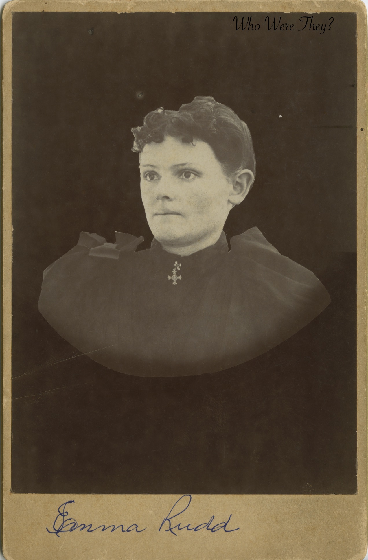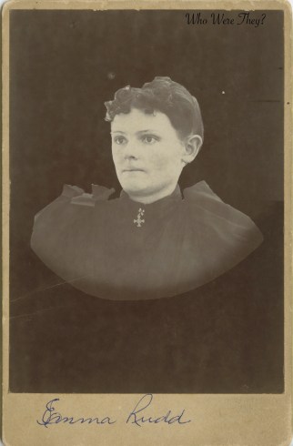 Another cabinet card with the strange rounded cropping. The clothing is indicative of the 1890s again, so my first impression that it was a photo cut out of another photograph and remounted. That could still be the case, but it isn’t an older photo reprint, as was often done. This one was identified as Emma Rudd.