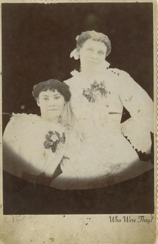 This cabinet card has the deckled edges popular in the 1890s, and the clothing also suggests that same time frame. You notice the image appears to have been cut in a rounded fashion along the lower portion of the girls’ bodies, and then placed on a brown field. Just under the girl on the left it says “me here” I think. The back identifies them as Ida & Catherine Rudd.