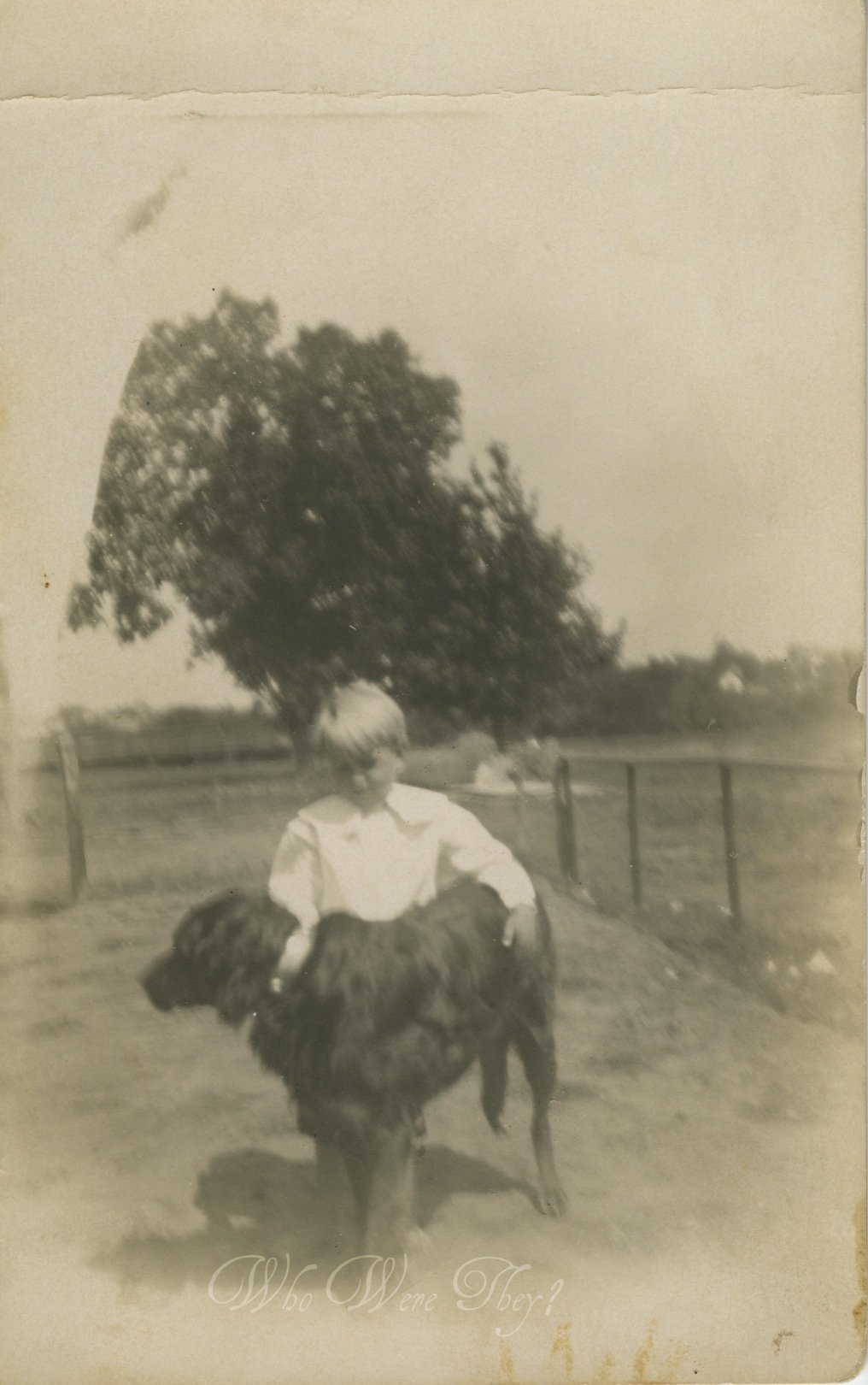 This real photo postcard from the Rudd collection is an AZO brand with the triangles all pointing up, so that dates it to between 1904-1918. The boy and his dog pose in the yard or field. The dog looks like a retriever of some kind. In the background there appears to be a picnic taking place. It’s a lovely, pastoral image that makes me think of easier, slower times, warm sunshine and the smell of outdoors – sun baked grasses, trees, wet earth and flowers…
