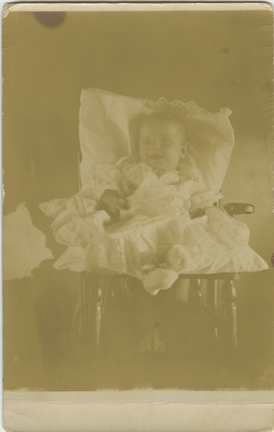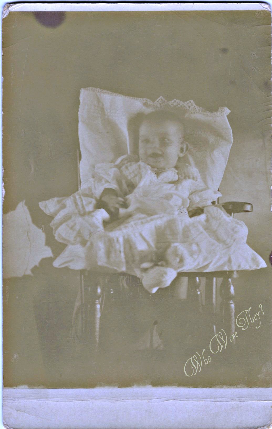 I still need some practice as this is a bit too purple and blue for my liking, but you can now really see the sweet smile on the baby’s face, the way he or she is tweeking his toes together, and the layers of fabric in the dress and padding. Again the photo is unidentified, unfortunately.