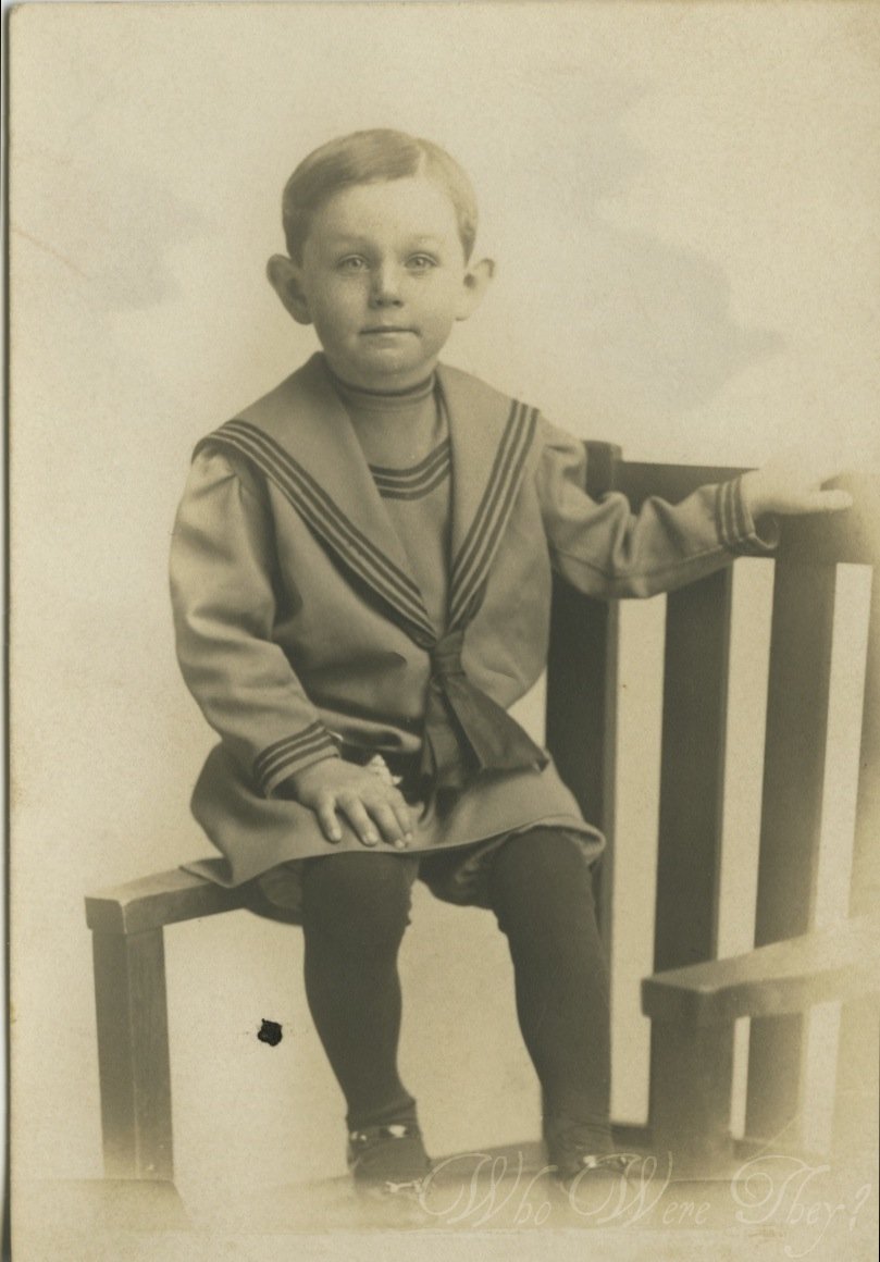 I always wonder at the thinking of a photographer putting a child in such a precarious location for a photograph. Were the parents at all concerned? Was this something that even crossed the Victorian & Edwardian minds of parents at the turn of the 19th to 20th century? This little fellow looks as thought he is safe, and so we shall not worry overmuch. Note his outfit has short elasticized drawers under it, much like the “tillies” under girls dresses today to cover a diaper. Yes they had elastic and yes they used it. Elastic was invented in the 1850s or 60s.