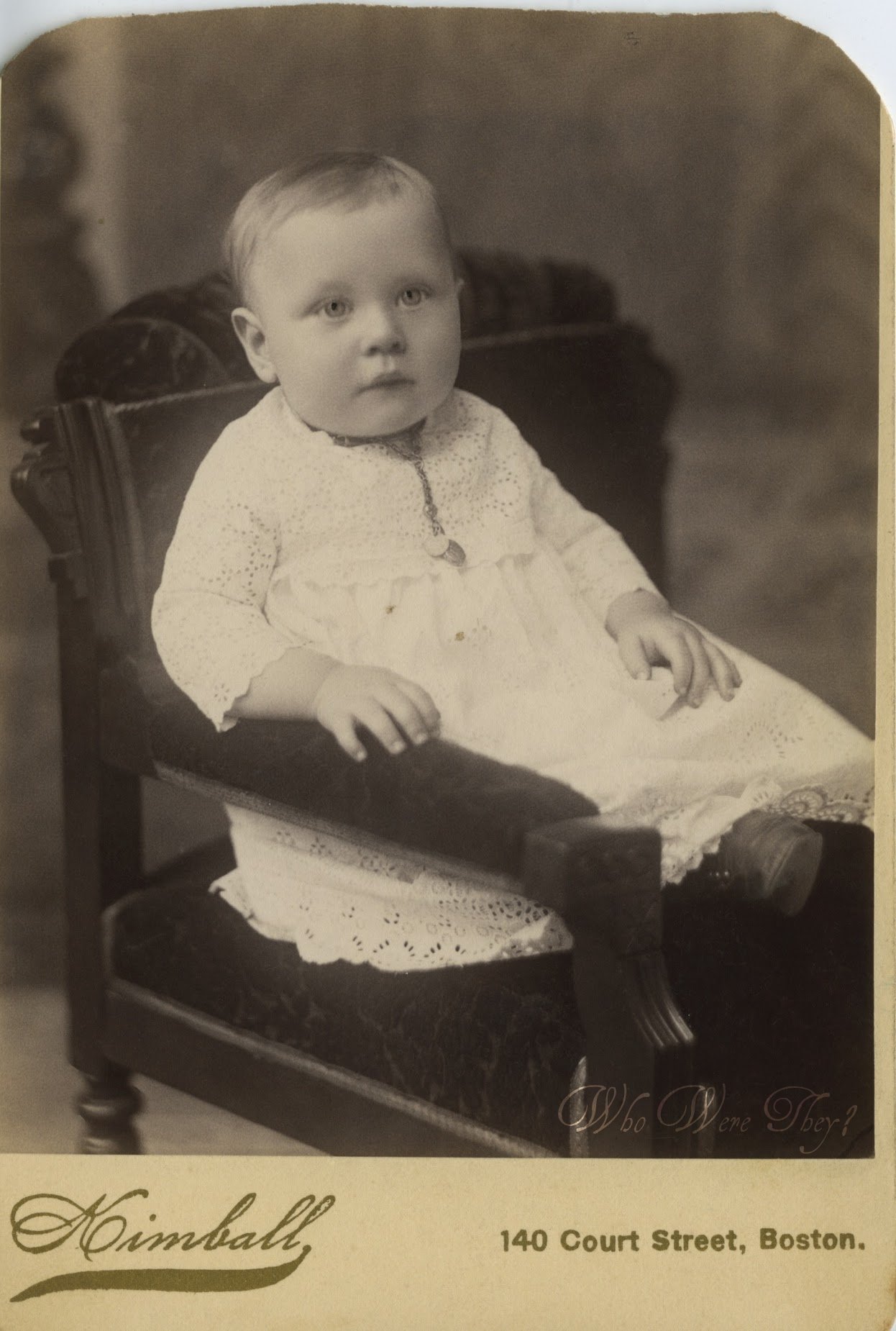 This particular cabinet card was trimmed along the top, presumably to fit into a frame. The child looks to be about 6 months of age, round of face and sweet looking. At first I thought this might be a boy, but then noticed the necklace, so am guessing at a girl. The chair is the typical velvet-upholstered affair common in portrait studios even today.