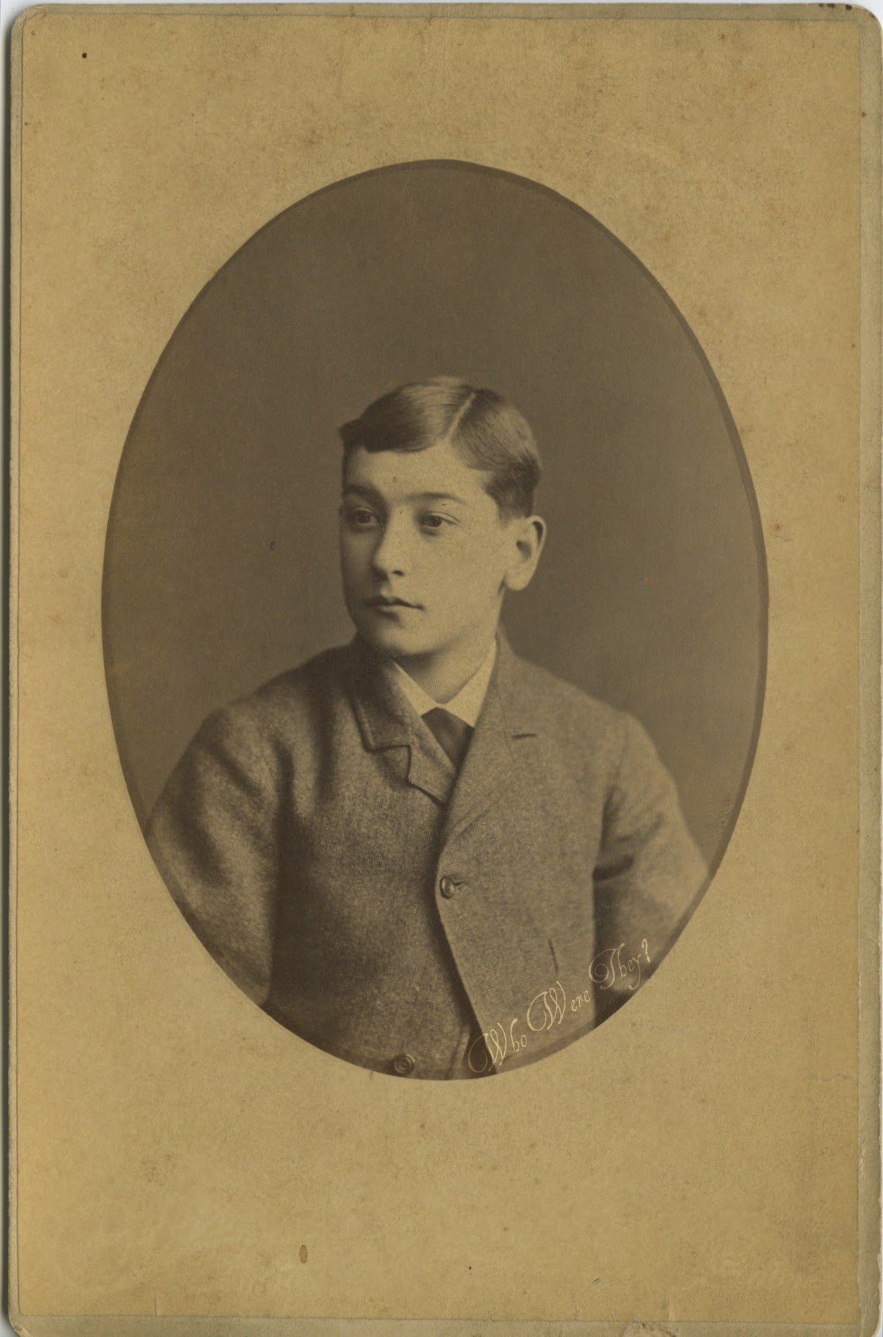 I see it too. If I tilt my laptop, the screen gives an odd contrast that brings out some letters. Judging the age of young people in close-up portraits like this is a challenge for me. We can’t see his height, or other family members, and with his polished hair and new suit he could be 18 or 12.