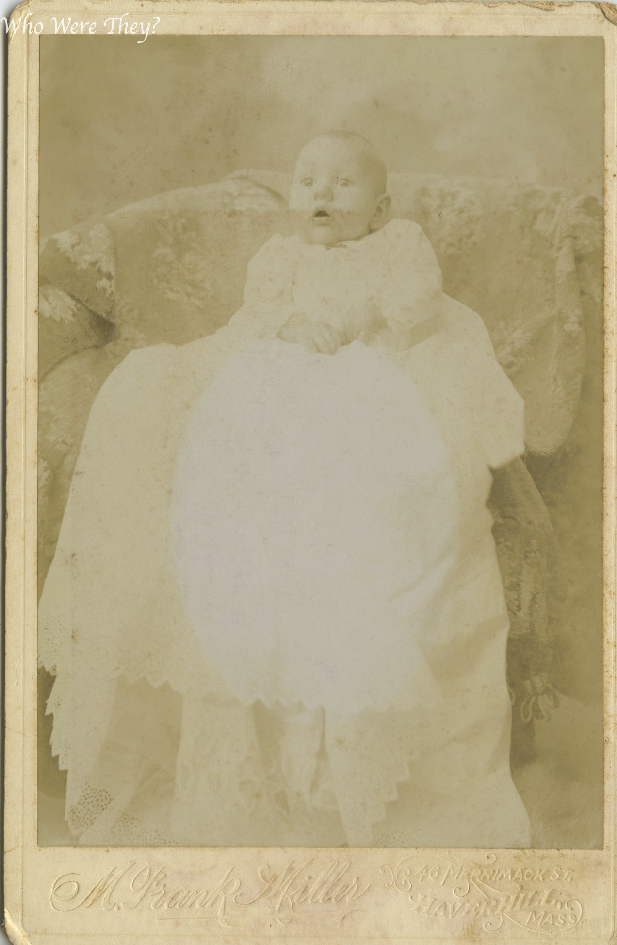 This photo was photographed by M. Frank Miller, who provided the previous image of our Little Lord Fauntleroy. This child is wearing a lovely, long dress. It is interesting to note that the photograph seems to have an oval shape, much like a frame or album opening, right in the middle of the dress – where a face might have been. I wonder where it was placed to have developed such an odd marking.