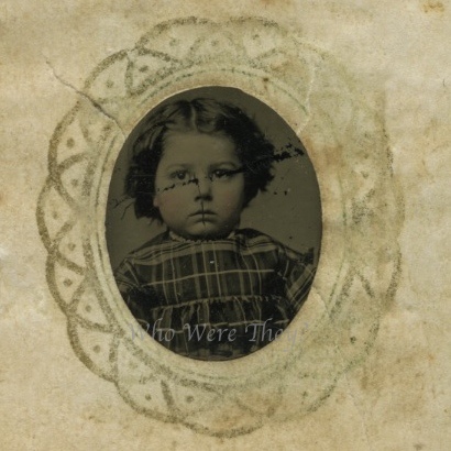 Juxtaposed with the lady above is this plump little face of a toddler girl. The center part in her curly hair tells me this is a girl. The cheeks of her face were tinted with a touch of pink, and while some people on the internet will swear that tinting is an indication of a deceased subject, this image clearly shows a bright eyed, living child. You will notice that the plaid on her dress is the same pattern as our previous child, shown here. A clever mother used every inch of yardage making these dresses for her girls. I imagine they were very lovely together!