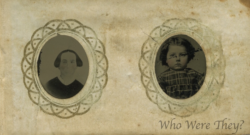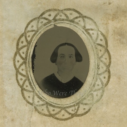 This image is probably a reprint – or more correctly a photograph of – a daguerrotype. They hair style and general characteristics of the image lead me in that direction. During the 1840s and 1850s, women dressed their hair in such a way that it wrapped around their ears and then toward the back of the head. Hair was parted in the middle and oiled so it would be smooth and shiny. Also a hint, the backdrop of the image seems to fall away from the person’s body, which is something I have noted in daguerrotypes. Unfortunately, the original image might have been light, and in the remaking of it, much of the facial features were underexposed. If you look closely you will eventually see the chin, jaw and mouth appear in the face.