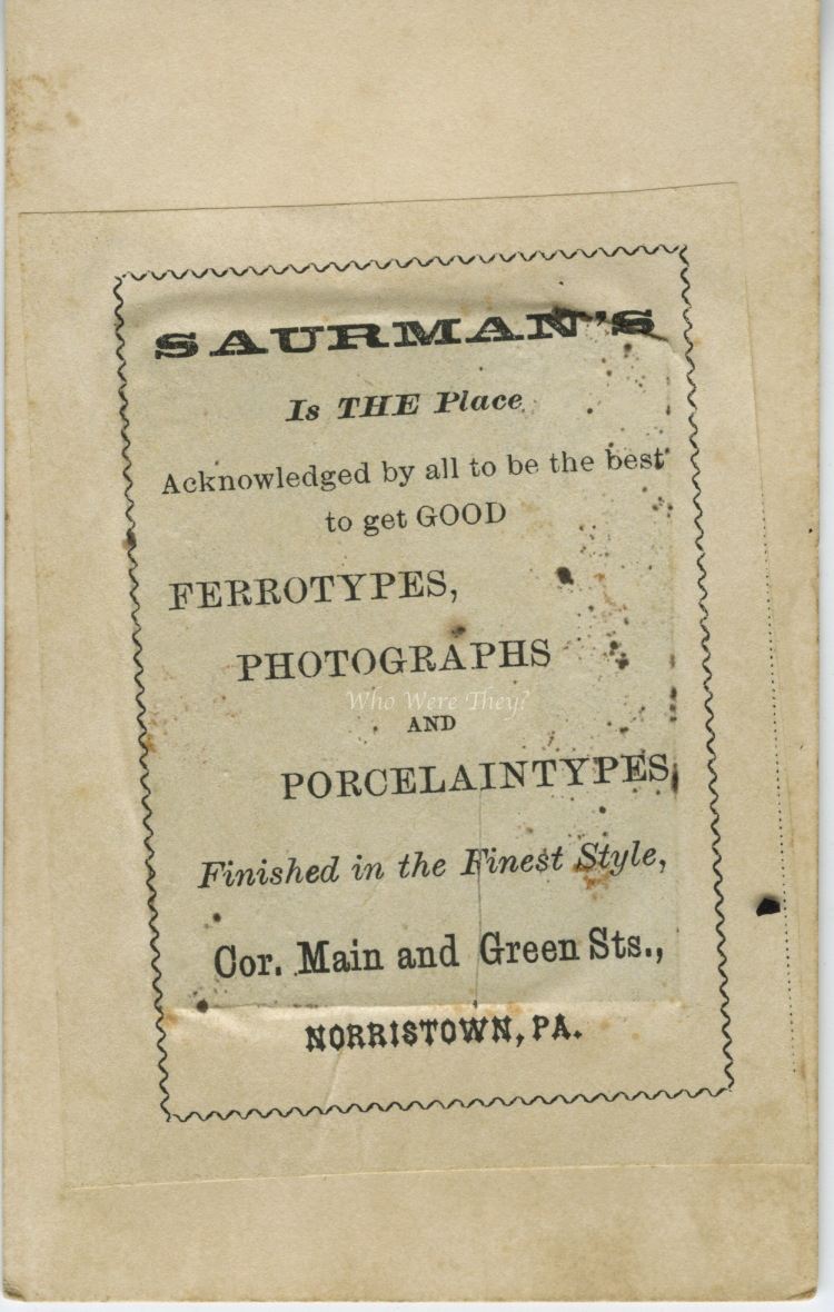 Thomas M. Saurman was a busy man! Born in about 1846, in 1860 he was living with his mother and family in Norristown, PA. One of the people living in the home was Frederick Spane, a painter, and someone who’s name comes up as an artist & photographer in the Norristown area. It is possible Saurman learned his trade from Spane or was inspired by him.