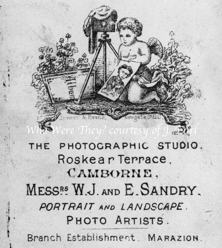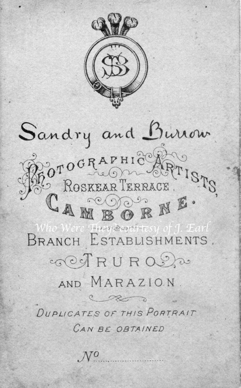 William James Sandry (b. 1843 – d. 1905) had a brother, Edwin Sandry (b. 1854 – d. 2 Sep 1918). He worked with John Charles Burrow. Camborne. Born at Truro 11 March 1852, died 28 October 1914.