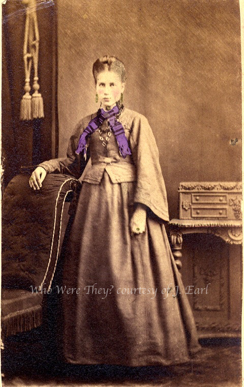 Based on the hairstyle and dress, I’m putting this image into the 1870s. Clothing styles and hairstyles changed drastically between the 1860s and 1870s. Skirts were not the full bell shape over cage crinolines, but instead smooth fronted and draped to the rear end, in the early bustle look. Pads and small pillows were added under the skirt to emphasize the lady’s backside. Hairstyles no longer accented a nice wide face, but instead added height and angularity. This lady shows us her lovely purple tie – hand painted by the photographer – and even has rather large earrings. Her bodice is called a basque waist as it lays overtop of the skirt in a separate piece, rather than the two pieces being sewn together into one dress. The photographers were William James Sandry and E. Sandry this time.