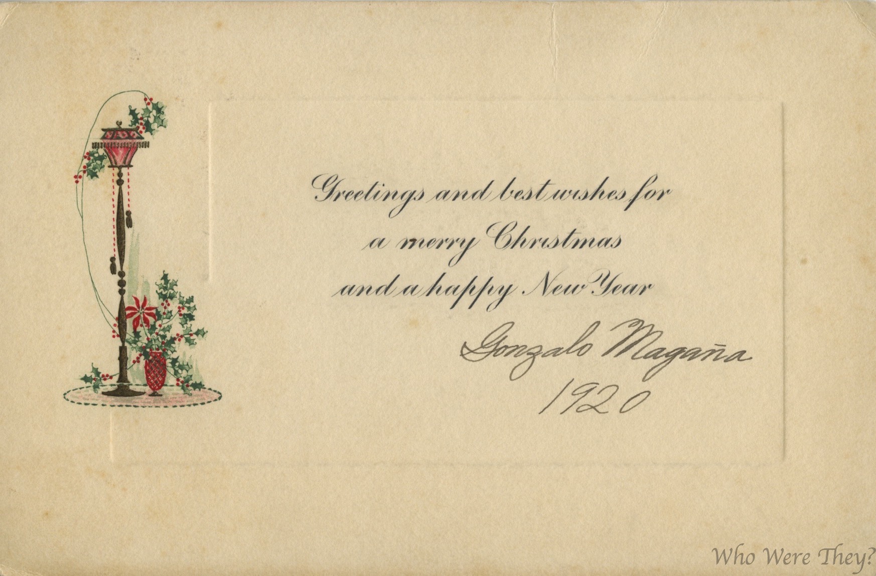 This particular card is about 3 x 5, and has an embossed center as well as embossed image featuring a lantern, holly and poinsettia. The greeting reads: