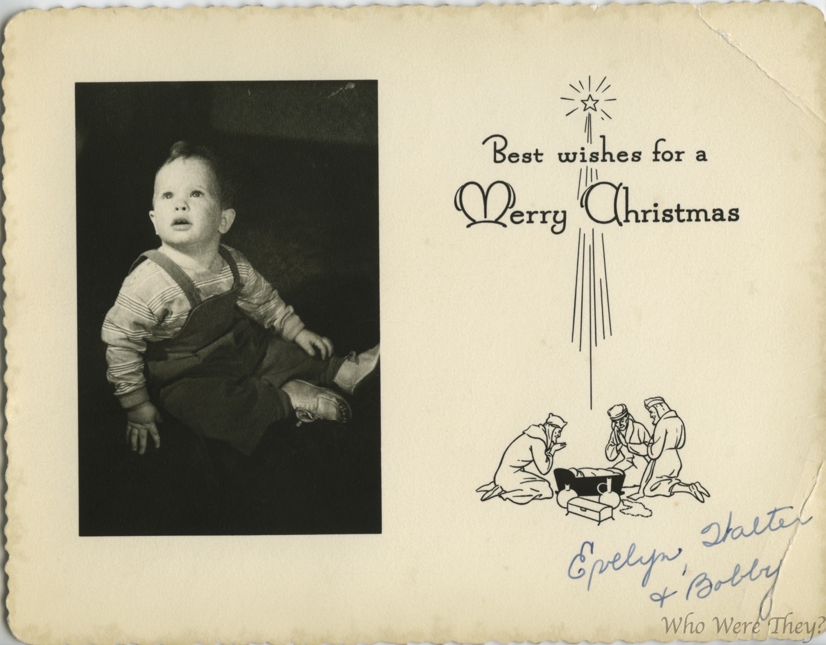 Best wishes for a Merry Christmas Mrs Marvel 1 comment December 13, 2014 Cute boy Jumping forward to the 1950s, when these photo Christmas cards really became popular, we see Bobby posed to look up into the face of the future. His parents were Evelyn and Walter. Share this:Tweet Click to email a link to a friend (Opens in new window) Email Click to share on Reddit (Opens in new window) Reddit More Click to print (Opens in new window) Print Share on TumblrLike Loading... Related