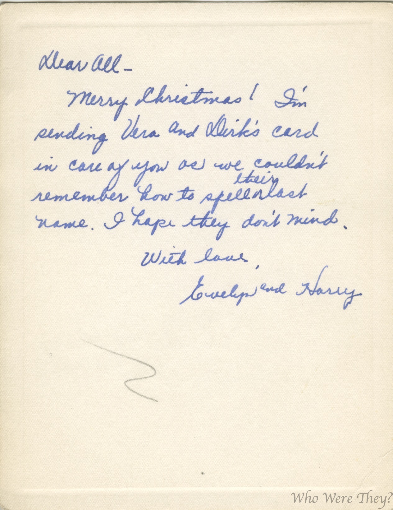 Merry Christmas! I’m sending Vera and Dirk’s card in care of you as we couldn’t remember how to spell their last name. I hope they don’t mind.