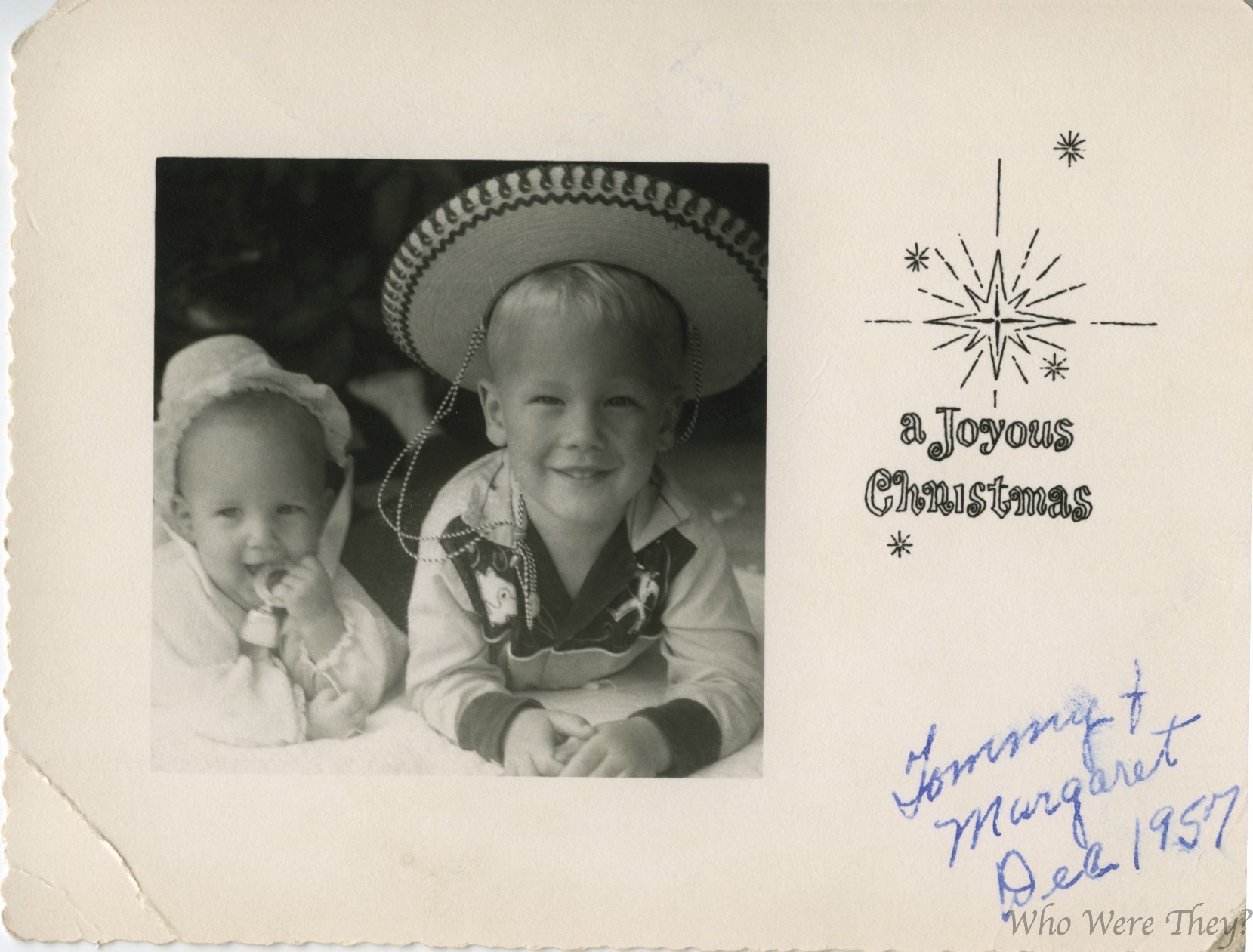 Here are Tommy & Margaret, or possibly the children of Tommy & Margaret, December 1957. The boy has a wonderful cowboy hat and embroidered cowboy shirt, complete with a ranch hand twirling a rope on the right shoulder and possibly a horse on the left. This style was a huge fashion trend for boys and girls in the 1950s, and I bet he also had the little six shooters and holsters. The little baby girl is wearing an adorable bonnet and munching on a teething ring. Old fashioned teething rings are nothing like our modern, gummy soft ones! They were hard plastic and many, like this one, featured a bell.