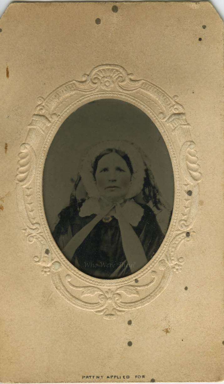 The woman in the photograph is showing off quite a lot of her finery. A wide collar, golden brooch, sheer shawl, fancy bonnet and a veil folded to the back. In the past, I would have immediately assumed the veil was indicative of mourning. However, in my recent exposure to some 19th century clothing experts, I learned that veils were worn as a type of sun block. The veil, often in black and dark green, muted the brightness of the sun and allowed the wearer to more comfortably walk in the sun. This veil appears to have some type of lace pattern on it. The dress, collar and bonnet all are 1850s fashions, but I believe this is an 1860s image. Whether it was reproduced after the fact (I don’t think so) or she liked these clothes (more likely) we cannot really know. It is a lovely image with fine hand tinting on her cheeks and the brooch is delicately gilded as well.