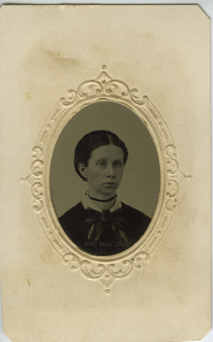 The subject appears to have on small earrings and a ribbon choker. Her collar was a folded over affair made of lace, and she has a large bow tied at her throat. She may also have an oval brooch in the center of the bow. While her countenance does not appear to be anything other than ordinary, Lovejoy managed to add a bit of blush tinting to her cheeks, making her look a bit more welcoming than an untouched photo might imply.