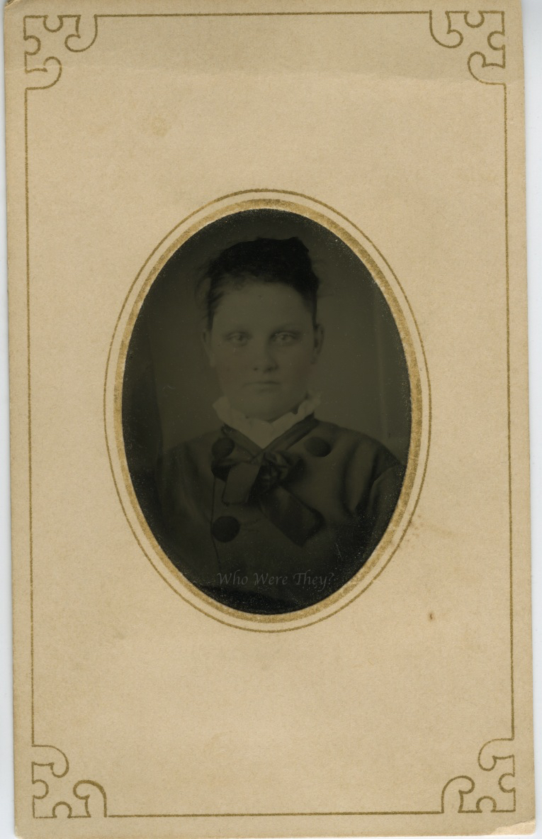 I would really love to see the rest of this dress, because it has so many features just in this tiny portrait. We have large decorative buttons that appear to be velvet covered, a large bow at the center of the neckline, and frilly lace standing up under the young lady’s chin. I like to imagine she worked hard on making this dress and that it is a bustle dress with lovely draping on the skirt that mirrors the velvet trimming on the bodice. This is the last in the Saurman & Lovejoy set, but does not carry a backmark. She is unnamed and unknown.