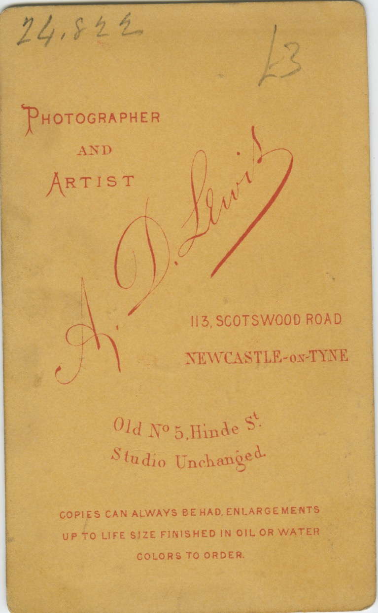 The back reveals that the image was made by Photographer and Artist A. D. Lewis at 113 Scotswood Road, Newcastle-on-Tyne. This may have been a secondary studio as it also indicates that “Old No. 5 Hinde St. Studio Unchanged.” I’m taking a guess at the decade of this portrait being made as the 1870s. There are slightly rounded corners, possibly due to age, but the weight of the card is not as light as those in the 1860s. The red ink used is unusual, but not unheard of, so that doesn’t help me. The style of dress is suggestive of the 1860s, but the style carried over to the 70s. Effectively I’m guessing by process of elimination. Anyone who knows better please feel free to comment and correct me. :-)