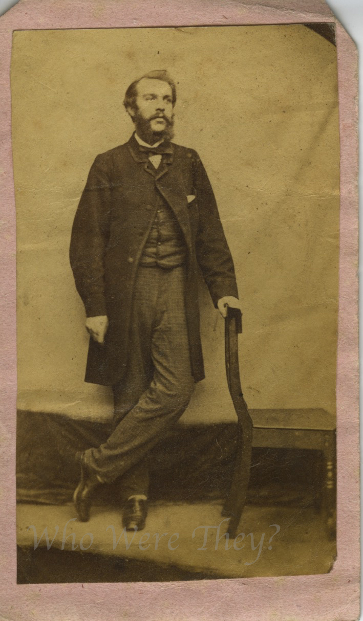 This CDV shows a man with fine whiskers, a fine coat and bow tie, clean if rumpled suit of clothes, and brogan style shoes, leaning his hand upon the back of a chair. I originally thought this photo was interesting but it didn’t really catch my eye. However, I took note of the weight of the pink paper it is mounted upon. This paper is slightly thicker than gift tissue paper, slightly finer than printer paper. It is quite delicate and I have not seen its like before now. What also caught my eye as I scanned the photo is that the lower edge of the photo was lifting slightly.