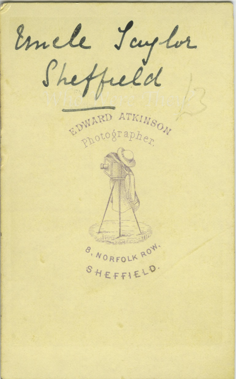 The photograph was made by Edward Atkinson at 8 Norfolk Row, Sheffield, England.