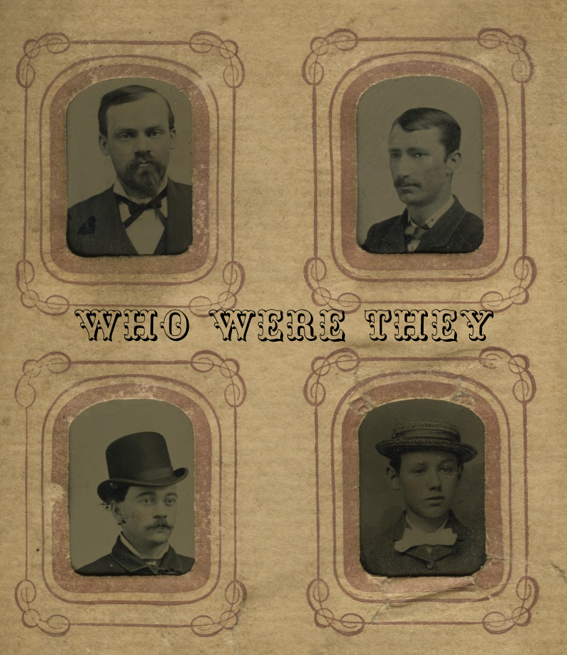 This next page in the Haberdashers album shows us hats, mustaches, beards and bowties. We have again the gent with his high topped bowler, there in the lower left. He must have been a placeholder on many of these pages being as he is used so often, and that begs the question of just who created this album. If it really was a haberdasher, why would he show the same hat over and over? With the young faces such as the one at the lower right, it seems less likely to be a businessman’s book as well. Maybe it was owned by someone who knew lots of men, in which case that begs the next question of whether these were members of a club, such as a Lodge or the like.