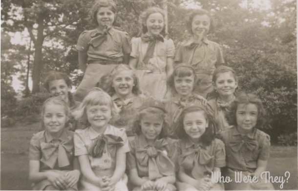 A group of Brownie Girl Scouts, somewhere. The uniforms are consistent with the 1941-1956 style, which featured four to six buttons on the bodice, a belted waist and short sleeves. The dresses were made from cotton and required pressing before wearing. Notice their large bow ties! Two of my Brownies will be modeling these uniforms but we don’t have the ties. I do wonder what color they were. The dresses themselves were light brown. It is possible the ties were red, green or orange. Also of note but isn’t really visible, the pocket on the left breast featured an embroidered Brownie. You can also just see that the girl in center front has on a Brownie beanie. These hats were made of felt and fit over the skull with the Brownie emblem to the front.