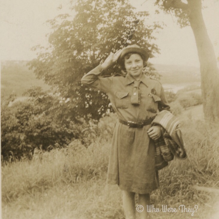This undated photo shows a young Girl Scout saluting with a backward three-finger salute. She has a tie, belt, hat and a shawl or coat over one arm. You can just see over her left pocket a round Girl Scout symbol, and in the center of her tie her pin. This uniform looks similar to those worn in the 1919-1927 era, although not exactly like others I have seen from that time. I’m venturing a guess at the 30s. The back of the photo says “Sis just before she left for camp.”