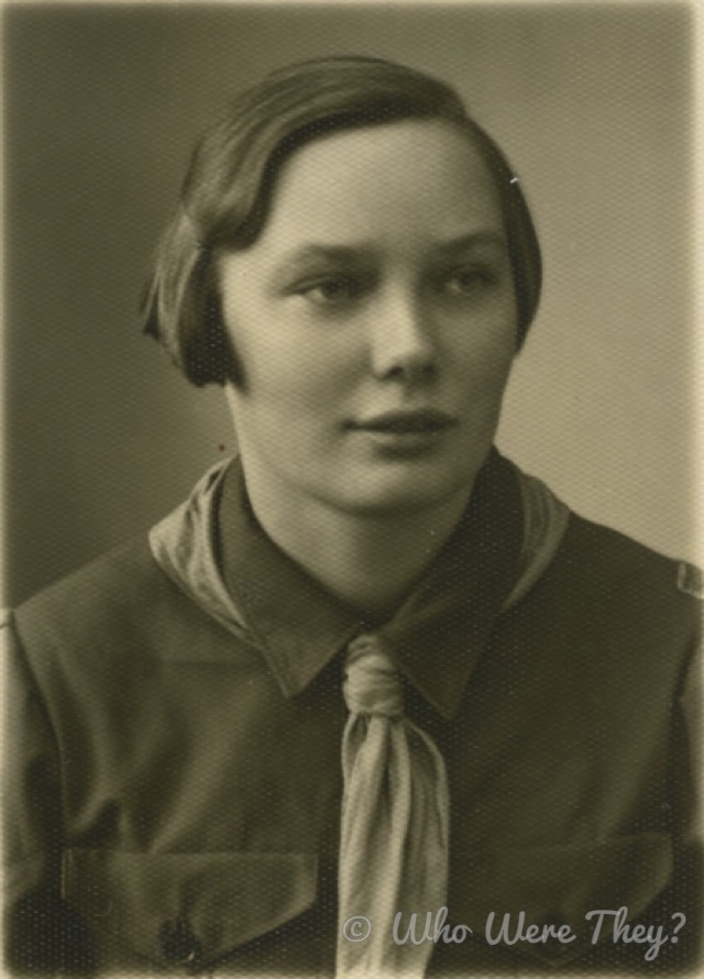 This photo is small, only about 2×3, and thanks to having scanned it we can enlarge the digital version for study. The young woman pictured was probably named Lii’le or Liile, something like that. Liile was an Estonian Girl Scout – or as they are known outside of the US, a Girl Guide. She wears a uniform similar to the early American uniforms, with a neckerchief tied under the collar. You can just see the insignia patch over her shoulder.