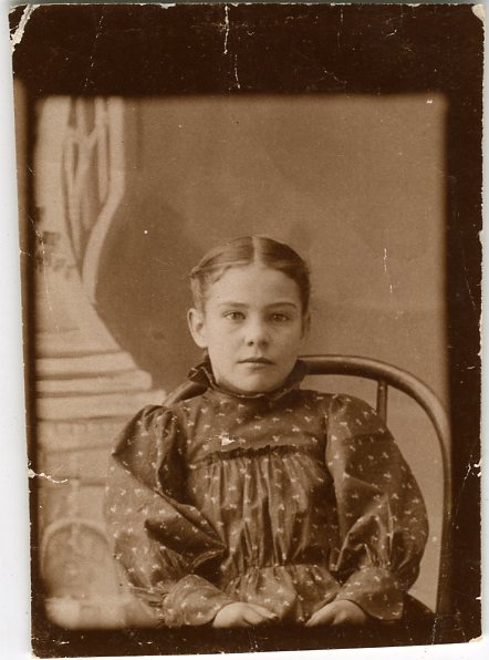This tiny photograph is the last photo from the C. Murray Album, and was tucked into the corner of a page, almost as an afterthought, though I like to really think it was so small it just didn’t fit into any of the other album slots. It was tucked in with the photo which I entitled Granny and her Grands, so I wonder if she is the girl in the photo. The photo itself is only about 1 1/5″ by 1 3/4″ and is on flimsy paper. I don’t know the era those types of photos came from; it looks to be a print of a glass plate or something similar.