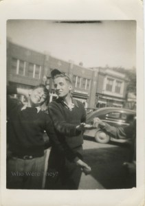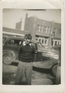 On the single photo, although it looks like the boy is wearing some sort of pin, it’s actually damage to the photo paper. In the photo of the two of them, it looks like the younger boy is holding an apple? a baseball? and someone off camera is handing Ray something. Impossible to know now what it was. They seem to be laughing and having a good time. After school joking around, maybe?