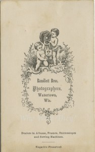The photographer here was Rundlett Bros. Photographers in Watertown, WI. With the inclusion of cherubic baby photographers in their backmark, we can infer they specialized in children. Also of interest, the children are holding a portrait of a corseted woman. The front of the card has lovely red border lines, one thin, one thick. Combined with square corners on the card, this puts the date in the 1864-1869 range.