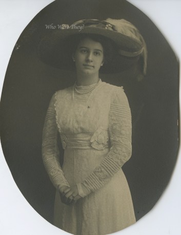 Her hat is enormous. Assuming she was an average 5′ 2″ and of slender frame, that hat has to be two feet wide! I can see flowers and feathers up there. I’m certain it was lovely in person. How exactly did one store a hat such as that?? She has a lovely dress with lots of lace, embroidery and pin tucks. By this time in photography, processes didn’t reverse colors in the way we saw in wet plate images (remember that images that look like black dresses could be yellow or red or green), so this dress was probably white or a light color. It could be a debut dress, graduation dress, or even a wedding dress. Modern generalizations would put this in the “Victorian” category but it is very obviously Edwardian to me. The photo was cut to fit into a frame and unfortunately all photographer marks are long gone.