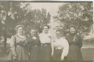 I presume that whoever wrote it didn’t know the ladies on either end of the group, so that would make Minnie the second from right. If you can zoom in on the dresses, they are certainly lovely examples of early 20th century Edwardian fashion. There are belts, pins, blouses, lovely hair styles, collar pins, and probably more I can’t see. I imagine the fabrics are woolen blend skirts and cotton or silk blend blouses. It seems so sumptuous to us today, but these were the more common fabrics of this time. Rayon was the only “synthetic” fabric available and it is made from wood fibers, so not really even a synthetic as we think of them today.