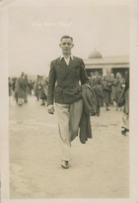 Today’s photo image is another photo postcard, showing a young man holding a coat, walking along a paved area. This could be a shore or beach promenade area. You can see a crowd of people milling around, all holding or wearing coats.