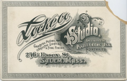 Well hello there! Up for perusal today is a cabinet card showing a round-faced lady with a serious expression. The photo was made in Salem, MA at the Locke Co Studio. Or, really, it was made by Gray & Hazelton, the successors to the Locke Co Studio. They clearly were using up stock and had the new name printed onto the cards. I found one other reference to this studio dated to the early 1890s. I wasn’t able to find a specific link to the Locke Co Studio, but there are many references to an Amos H Locke in Massachusetts from 1872-1881 in the towns of Athol Depot, Clinton and Plymouth. These three towns range from 60-80 miles away from Salem.