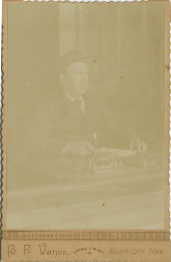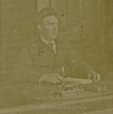 Here’s what I could come up with by changing the lighting and sharpening the image. You can see a young man sitting at his desk. His telegraph is in front of him, and there is a sheet of paper on the desk. You can see he has a cap on his head, a nice necktie, buttoned coat, and some kind of watch fob near his waist. He must have been proud of his work. I wonder if he worked for Western Union.