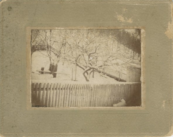 April snow is not the name of anyone, just that this photograph was dated April 22, 1901 and it shows a yard covered in snow. This type of photograph is possibly an example of an early snapshot. The camera was more available for personal use after the turn of the century, and this photo doesn’t seem to be set up in an artistic fashion as a professional photographer would have done. It feels like an amateur photo. I believe once the person had their film completed, they took it to a photographer or studio for development and mounting. I hope for our neighbors in northerly climes that they don’t experience April snow next year!