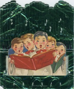This card is mounted on green foil embossed to look like a church organ I think. The boys choir sings from a red book and behind them are music notes. The red book indicates the edge of the front of the card, and where the recipient will open it to reveal the two boys inside singing from a green book.