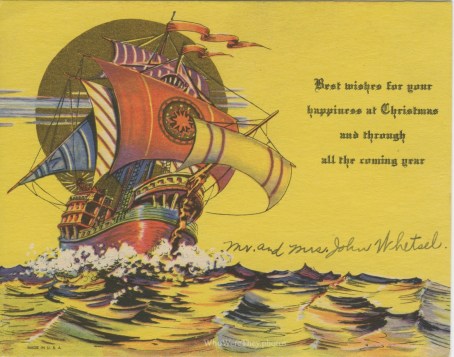 A bright yellow card features a schooner at full sail on the open ocean. Note the many colored sails. I have heard of sails being brightly colored, striped, or otherwise patterned. The sentiment reads: