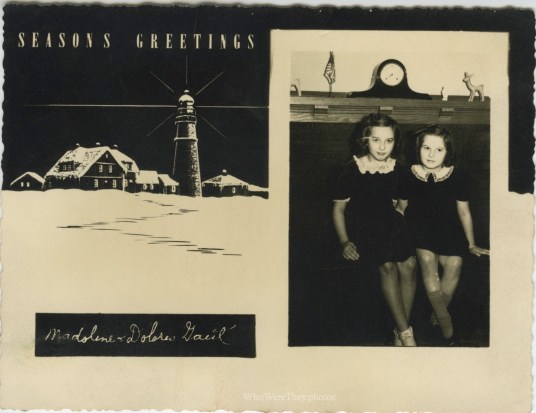 A pair of sweet girls pose before the mantle. The card is signed by Madeline & Dolores Gaut. Not sure if the girls are Madeline & Dolores, or if those are their parents or what. Note that the mantle displays a clock, an American flag & two deer statues – possibly reindeer for the holidays. The card itself features a black & white scene of a lighthouse in the snow.