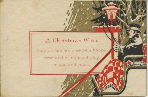 This postcard style greeting shows a coachman with a checkered blanket on his lap, paused at a light post, with golden trees in the background. The greeting reads: