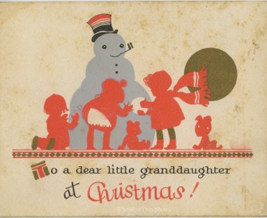What a sweet greeting for a child. This folded card is made of heavy cream card stock and features some gilding. The front shows us a “Frosty the Snowman” type character with children all around. The snowman is silver and the sun or moon is gold. The front reads: