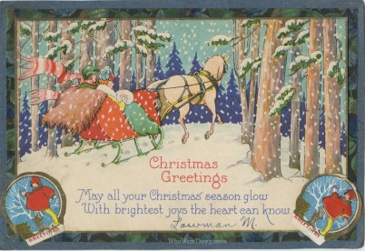 This particular card is a multilayer item. It consists of the card with a sleigh scene, a layer of patterned paper, and then the dark blue backing. The two smaller circle images on the front are almost like stickers, but probably they were pasted on. The sleigh scene has a couple bundled in blankets riding behind a white horse on a snowy lane. The sentiment reads: