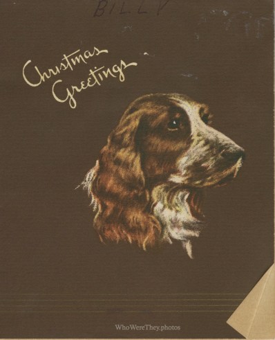 This is an interesting color choice for a holiday card – dark brown. However it showcases “Billy” the dog quite nicely. I don’t know hunting breeds very well but I think it is a springer spaniel.