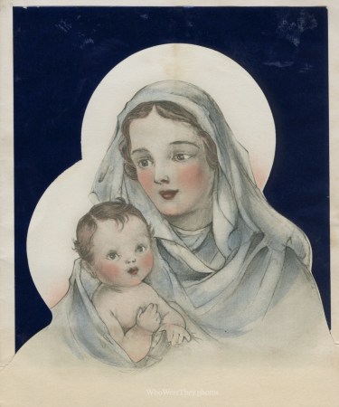 A pretty card depicts an angelic mother and child on a blue foil background.