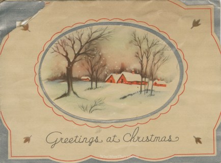 There’s always one that comes a day late, isn’t there? A snowy scene is encircled with silver and red, and declaring Greetings at Christmas.