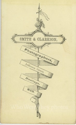 The photographer was Smith & Clarkson in Hastings, MI. Based on the square corners of the card, I’m putting this in the end of the 1860s, maybe 1868 or ’69.