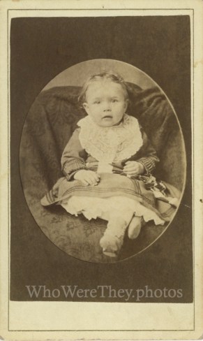 Baby is carefully posed on a wide chair, with one food folded under the other leg. The clothing looks well kept and nicely made. I can’t tell by the hair if this is a boy or a girl, unfortunately.