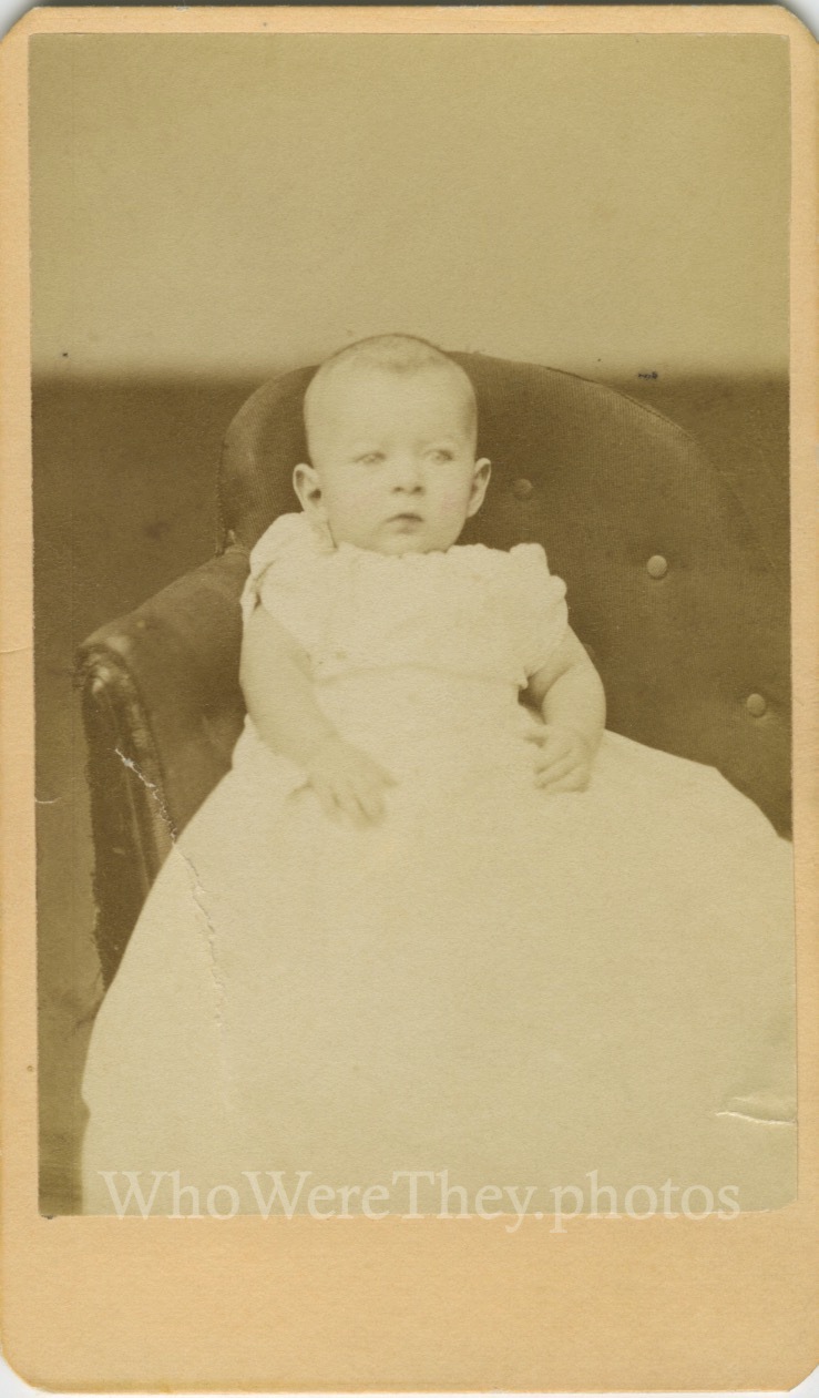 Today’s baby photo is a sweet one. Baby reclines on a padded chair in a sweet infant dress. Typically all infants were dressed in long white dresses. This allowed for mothers to access diapers easily, and in some ways prevented children from learning to crawl early, as the dress skirts would hamper their movements. White dresses were used as they could be boiled & bleached to remove the various stains that come along with babies.